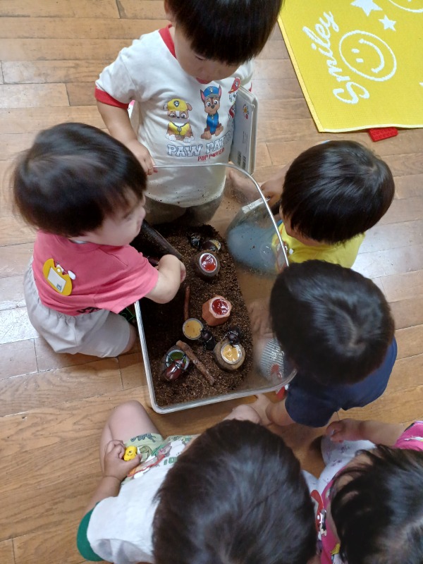 保護者の方よりいただいたカブトムシの幼虫が無事に成虫になりました。クラス別活動や登降園時に、生き物好きな子どもたちと、触れ合っています。