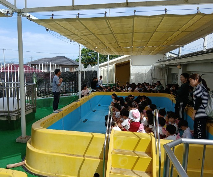 今日は洪水により保育室が浸水した場合を想定しての避難訓練を行いました。